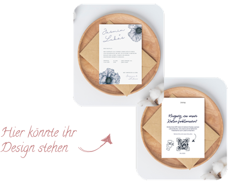 Sie suche ein besonderes Kartenformat, eine spezielle Größe oder etwas ganz anderes für Ihre Einladung? Kein Problem – wir lieben kreative Ideen und setzen individuelle Designs gern für Sie um.