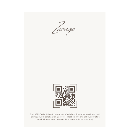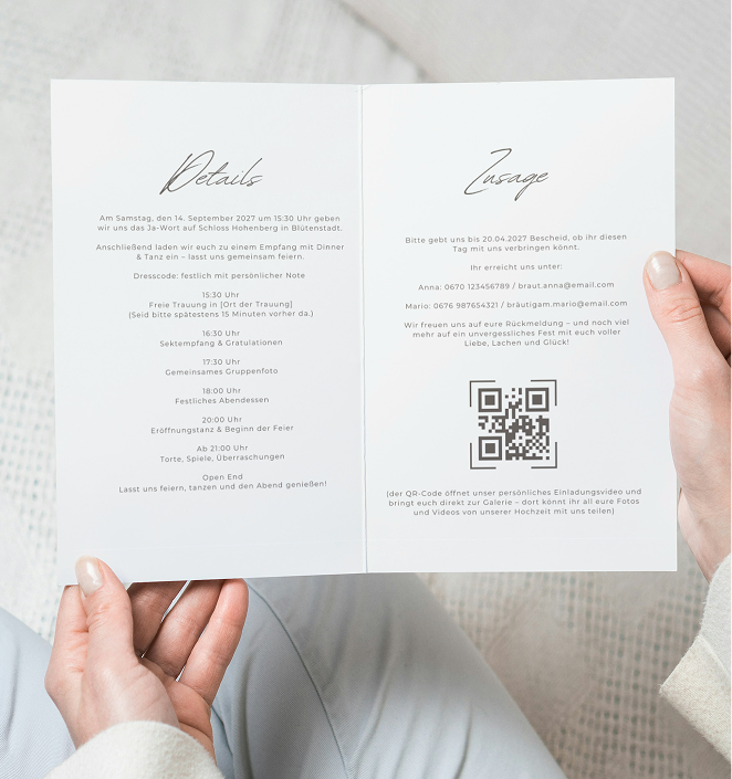 Auf der Rückseite: Ein QR-Code, über den eure Gäste eine persönliche Videobotschaft abrufen können. So übermittelt ihr nicht nur Datum und Ort, sondern echte Emotion – direkt aufs Smartphone, ganz ohne App.